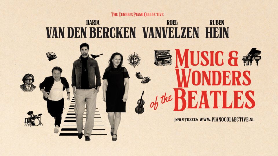 Rockpianist Roel van Velzen, jazz/soulpianist Ruben Hein en klassiek pianist Daria van den Bercken bundelen de krachten in het theaterconcert Music & Wonders of The Beatles! Een unieke show waarbij ze The Beatles ‘gebruiken’ om de rijkdom van muziek te etaleren én te vieren.
