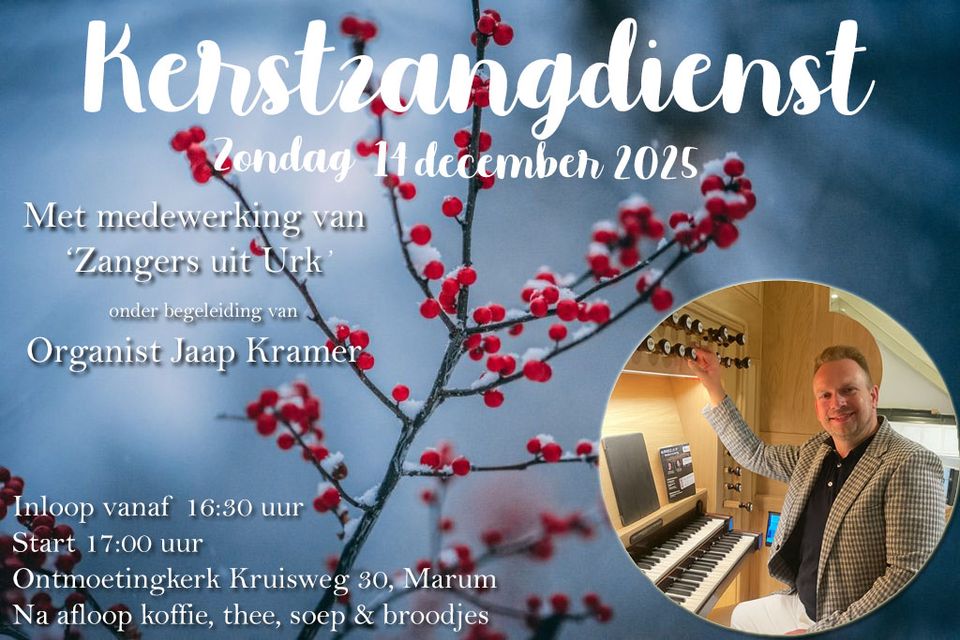 De drie kerken in Marum organiseren samen weer een Kerstzangdienst op zondag 14 december. Het belooft een mooie zangdienst te worden, met medewerking van Harmonie Marum, Zangers uit Urk en onder begeleiding van bekende organist Jaap Kramer.