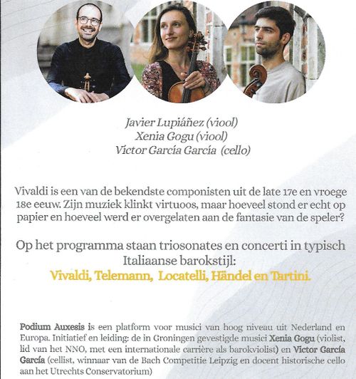 Podium Auxesis speelt Italiaanse Barok. Met zwier, fantasie en aanstekelijk enthousiasme hoort u de vrolijkste, treurigste, grilligste, kortom rijkste Italiaanse baroksonates. Het enorme repertoire voor twee violen en bas, uitgevoerd op barokinstrumenten. De cello neemt alle akkoorden en geïmproviseerde tegenmelodieën voor z'n rekening.